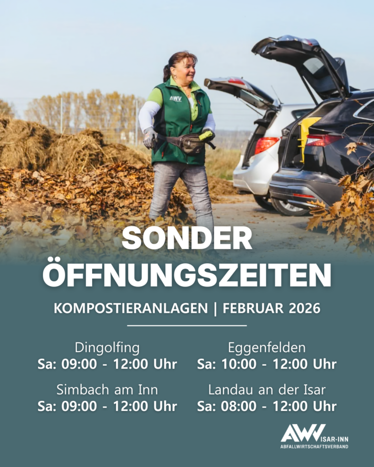 Neben den ganzjährig geöffneten Kombianlagen werden im Februar die solitären Kompostieranlagen an den vier Städten Dingolfing, Eggenfelden, Landau an der Isar und Simbach am Inn samstags zu den üblichen Öffnungszeiten...