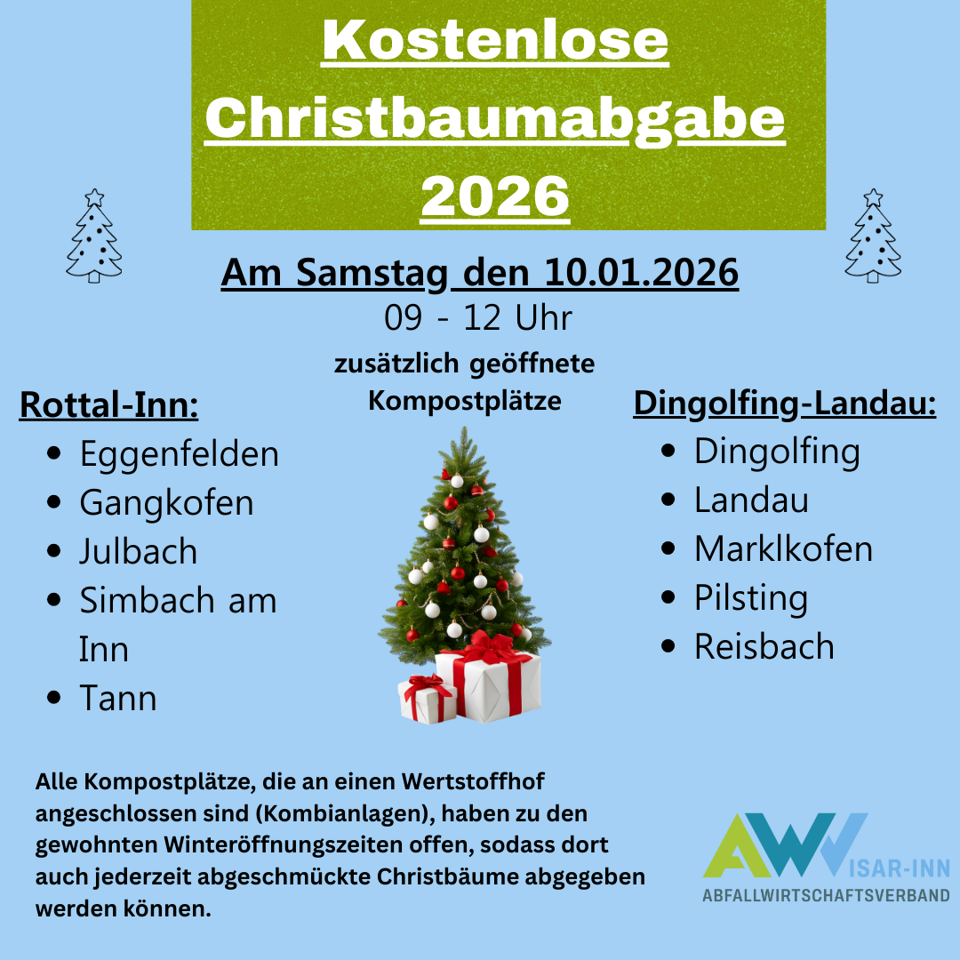 Alle Kompostplätze, die an einen Wertstoffhof angeschlossen sind (Kombianlagen), haben ohnehin regelmäßige Winteröffnungszeiten, sodass dort jederzeit abgeschmückte Christbäume abgegeben werden können.
