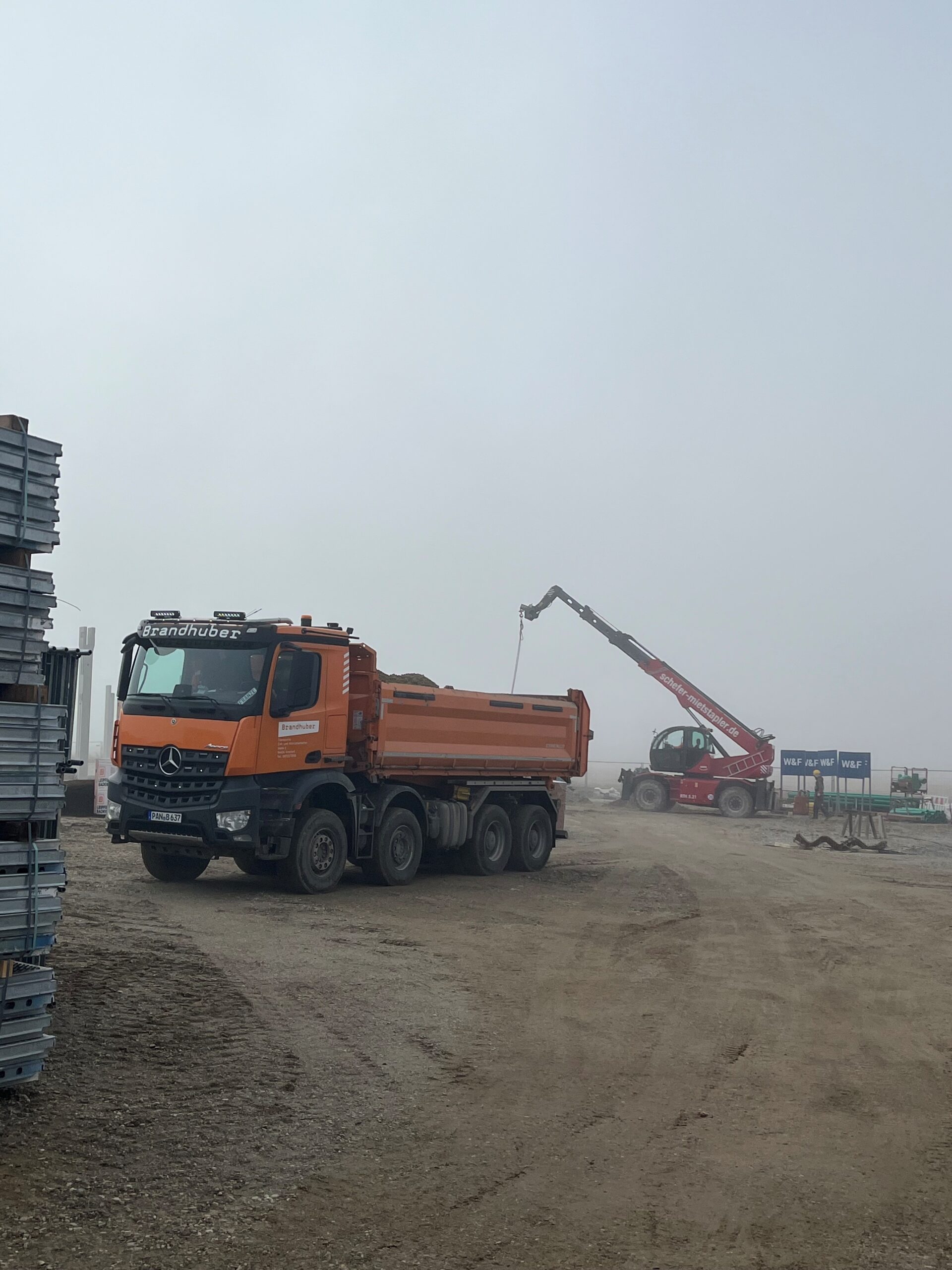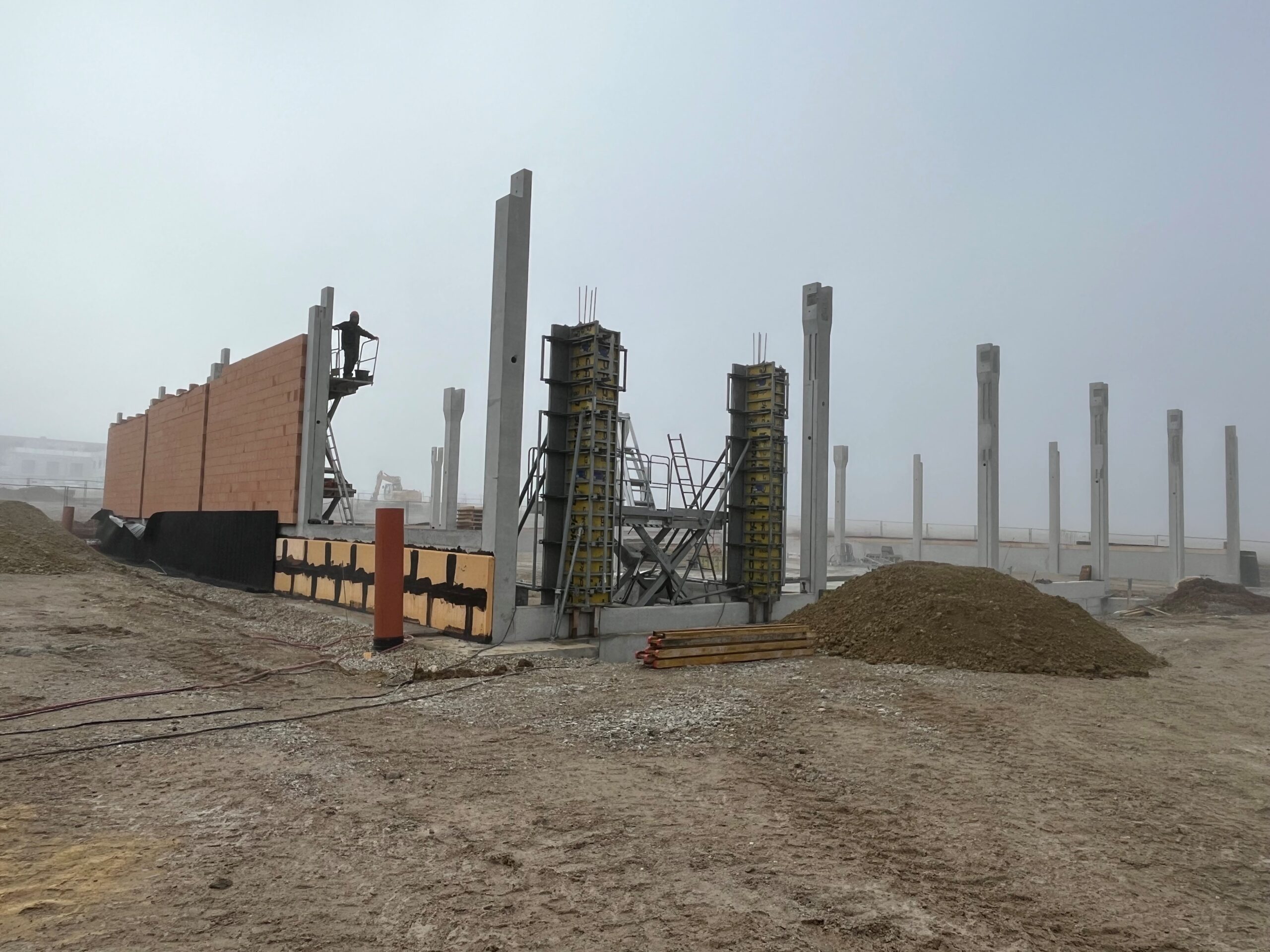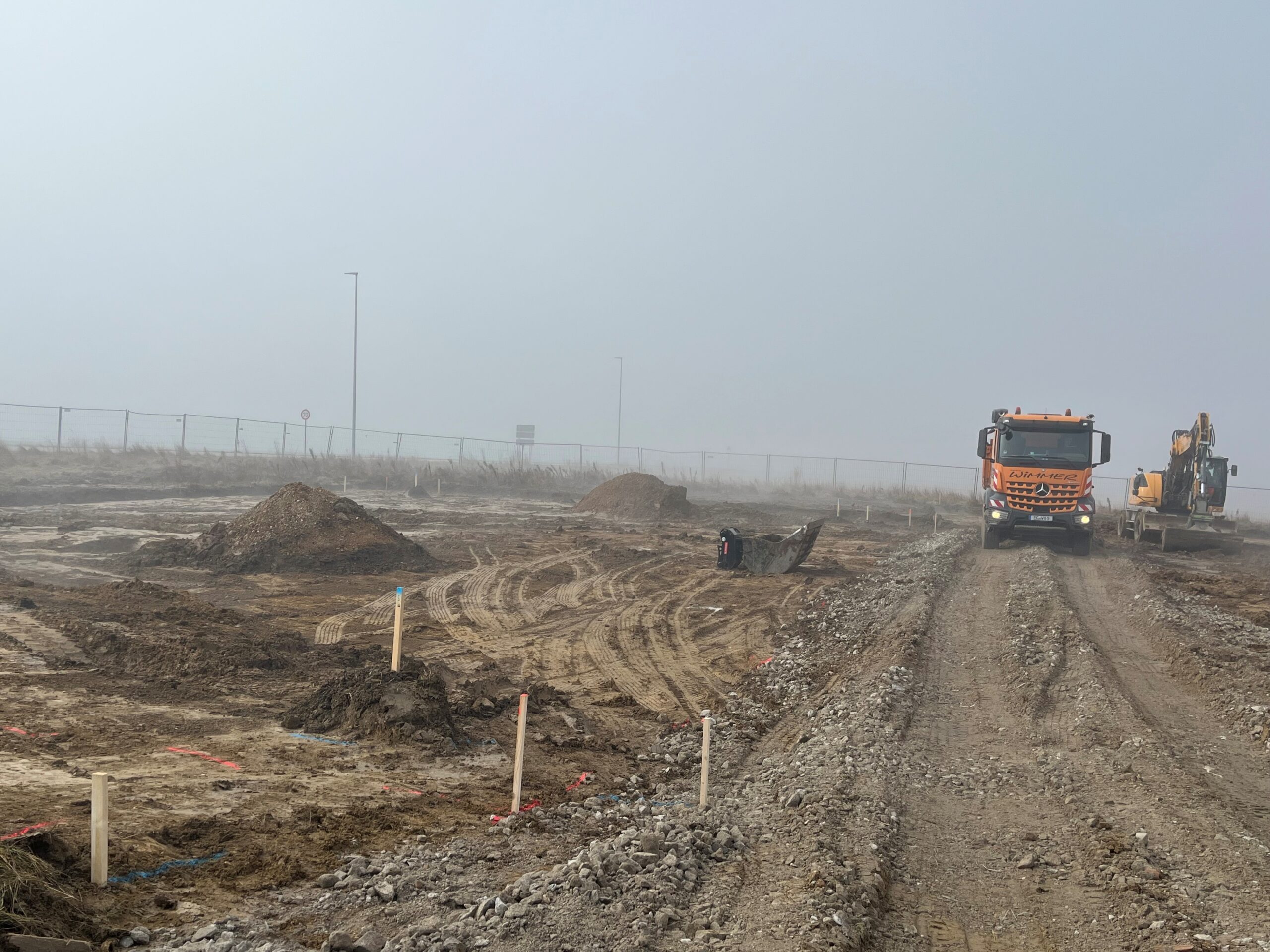 -> Die Baustelle erwacht wieder zum Leben. Während die Mauererarbeiten der Lagerhalle in vollem Gange sind starten die Erdarbeiten des Bürogebäudes.
