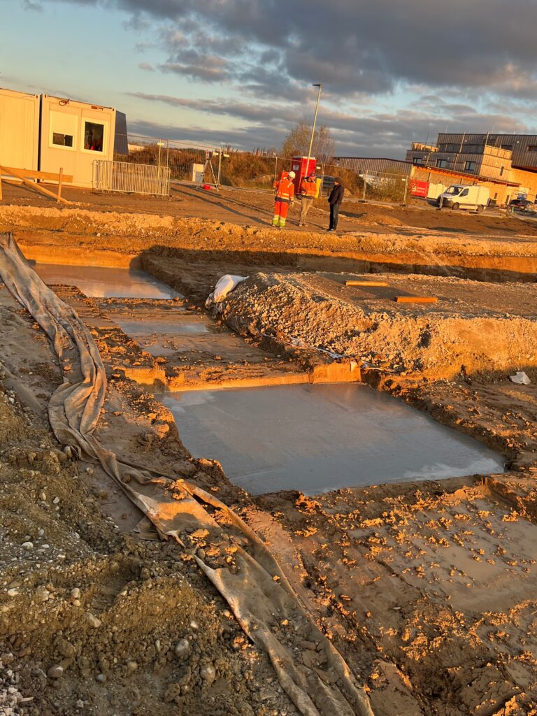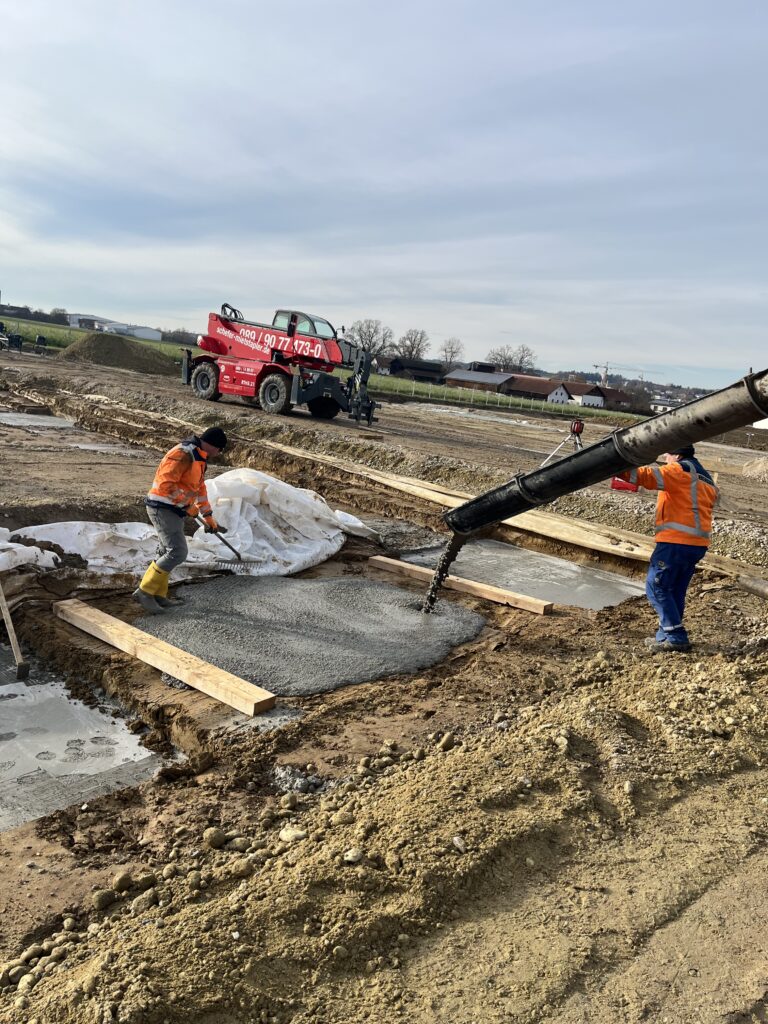 > Der Betonmischer ist in vollem Einsatz. Die Fundamente der Lagerhalle werden gefestigt.